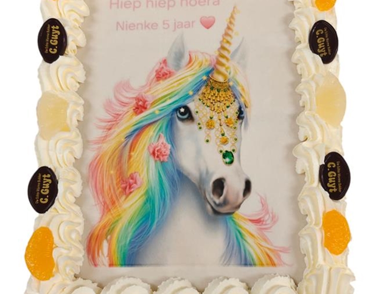 Fototaart gesneden voor 24 personen. Gevuld met 2 lagen slagroom en omhuld met witte marsepein met uw eigen afbeelding.